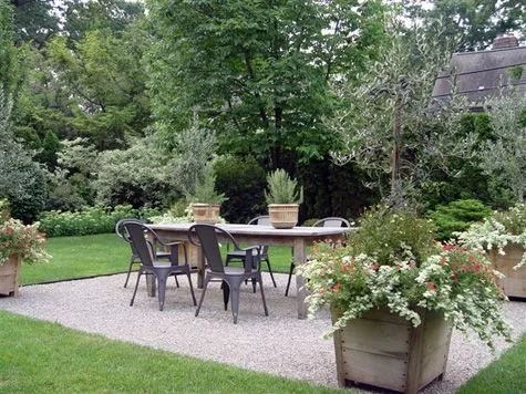 On our current list: a patio at the back of the house, a patio on the side and a converted guest house with attached garden (plus pool, garage....by that time we might as well just move). All of the above require a lot of thought and money, so we picked the area that needed the most attention, the patio in the back, and scoured the web for inspiration. We knew that this patio would be smaller due to space constraints with our back property line; we knew the larger patio off to the side of the house would be flagstone; we knew that this space would be mainly used when we were grilling dinner and because we like the casual look of peagravel...we started to scour the web for pea gravel patio inspiration.
